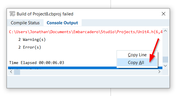 Can you perform a full build of the project, then copy the text (right-click, Copy All) from the Console Output tab in the Compile Window into a text file and attach it here, or send to support@jomitech.com?