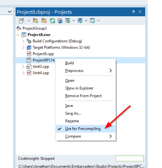 Hello, I am currently using TwineCompiler version 5.3.2 with C++ Builder 10.4. Recently, when building the project, I encountered an error where PCH.h is not being prebuilt. I am reaching out for assistance regarding this issue.