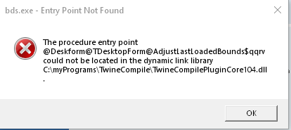 The error is: "The procedure entry point @Deskform@TDeskForm@AdjustLastLoadedBounds$qqrv could not be located in the dynamic link library <path to tc>/TwineCompilePluginCore104.dll".