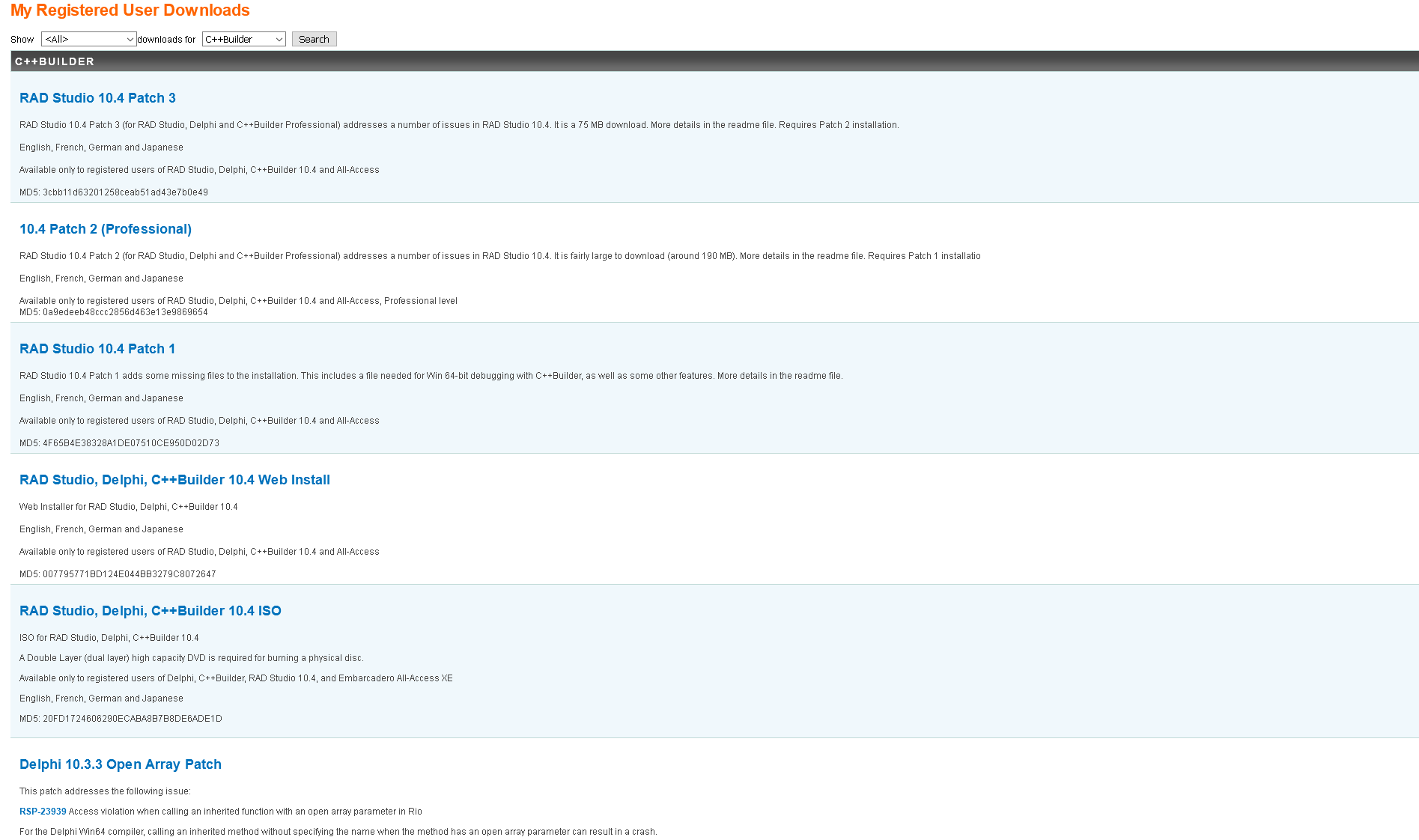 thanks for the reply, but where do I get this 10.4.1 from? We have an active C++ Builder subscription, so I should be able to see all available downloads. Still, I can only download 10.4 and 3 patches (see below a complete list of what I can download from the membership site @Embarcadero).
